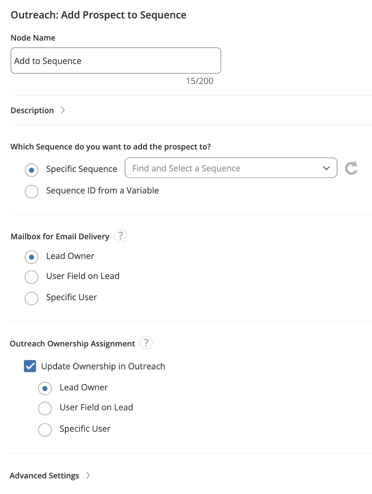 With this option, you will select a specific Sequence from a dropdown list of public Sequences synced from Outreach.