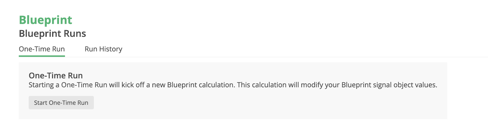 Once all of your Blueprint configuration is set, kick off a One-Time Run to generate or regenerate all of your Blueprint data.