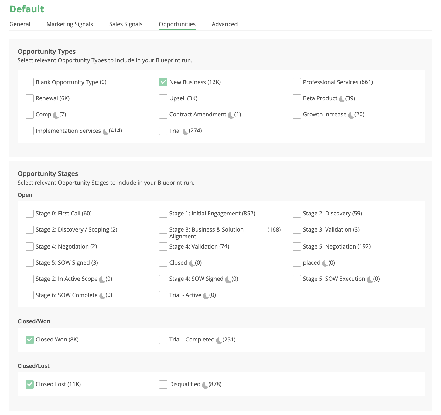 This section allows you to define which Opportunities will be included in your Blueprint run. For example, you might not want Renewals or some operational opportunity type included your Blueprint analysis. You can exclude Opportunities based on Opportunity Type, Opportunity Stage, Closed/Won Stage, or Closed/Lost stage.