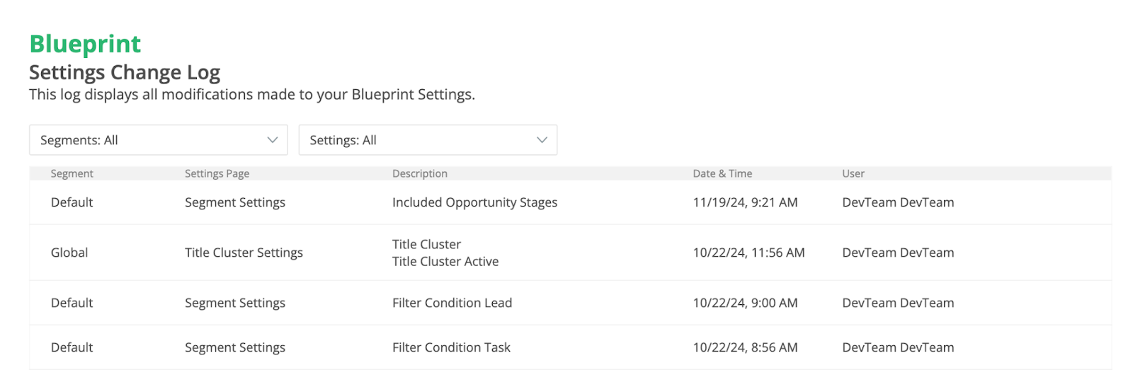 The Settings Change Log displays all changes that are made to your Blueprint settings. Each entry includes: