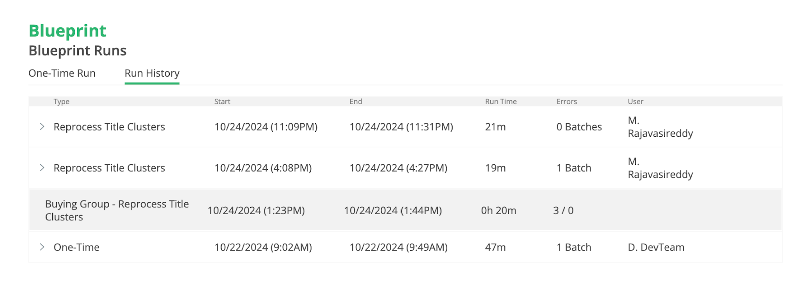 The Blueprint Runs section gives you visibility and control over when your Blueprint Runs process as well as details as to how they are performing.