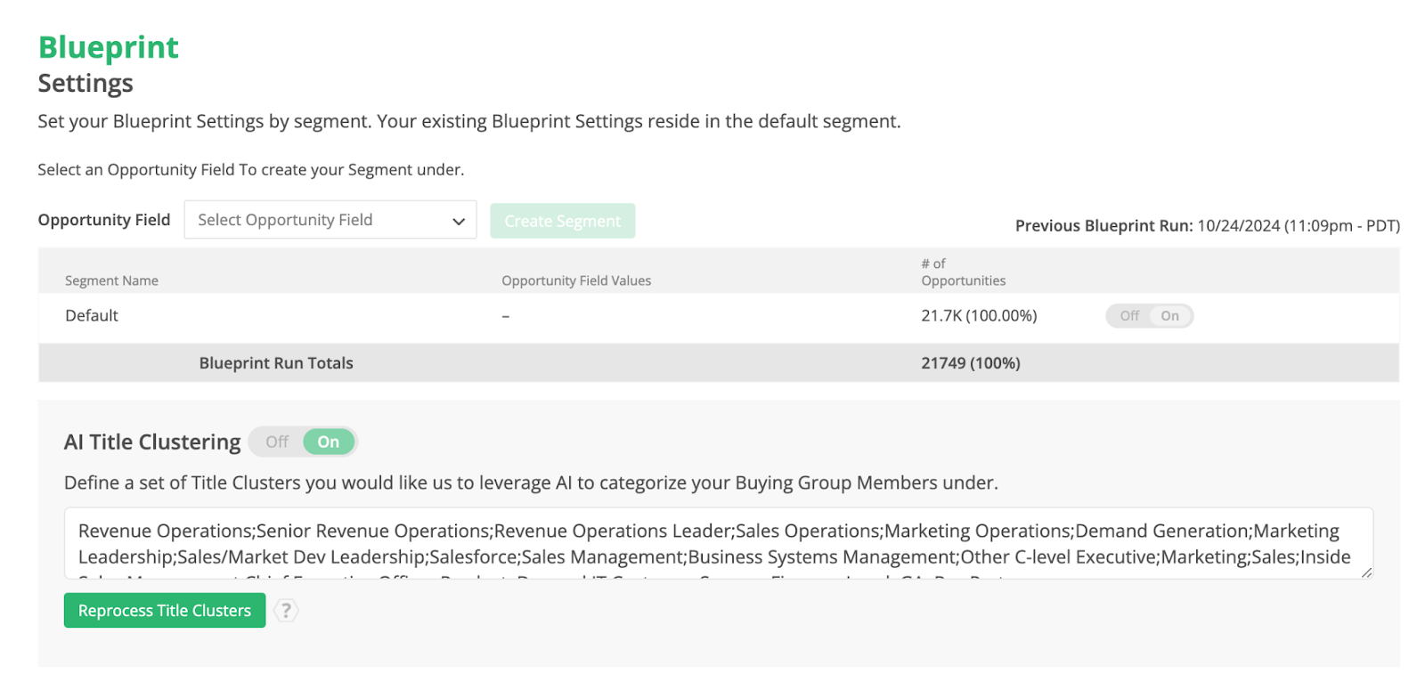 This is the main landing page for the settings section and is also where you can set up Opportunity Segmentation and Title Clustering.