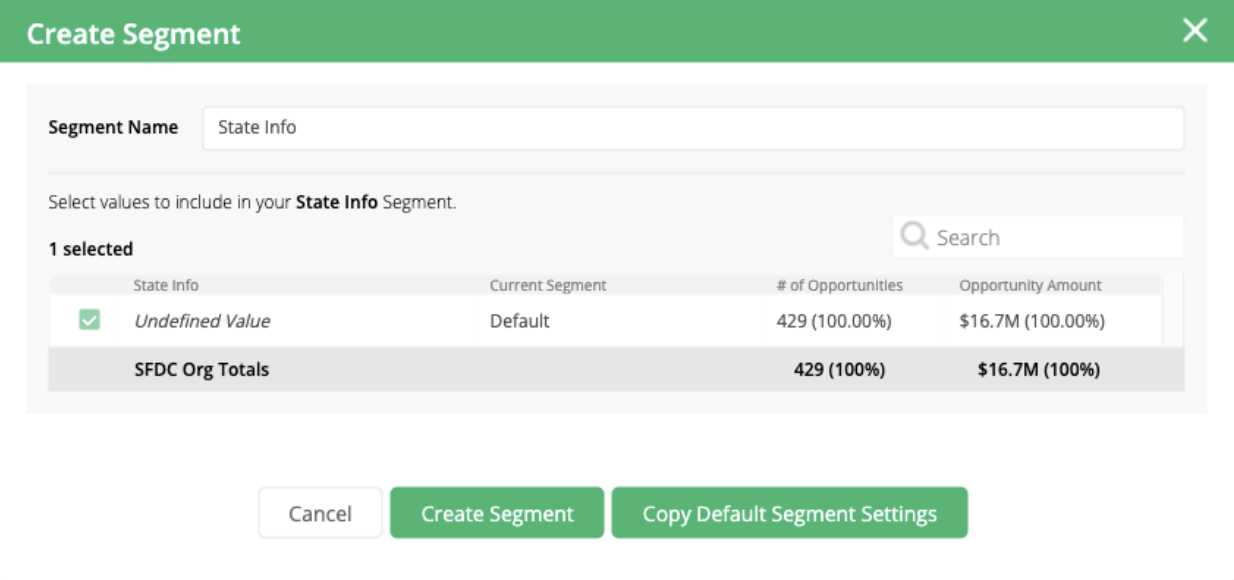 To create a new segment, select the desired Opportunity Field and click the Create Segment button.
