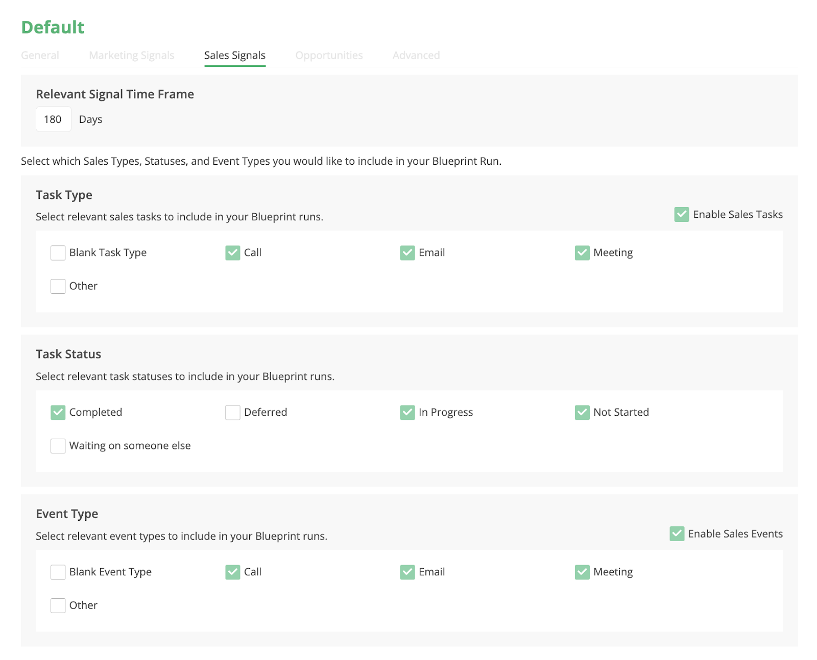 This is where you can set which Tasks and Events are included as Sales Signals for your Blueprint run. Select which tasks and events are relevant based on their Task Type, Status, or Event Type. If those three fields are too broad you can also add filter conditions on the task and event objects in the Filters section under Advanced in Settings.