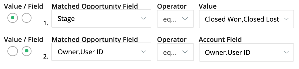 For example, if you want to Filter out Opportunities owned by the same person that owns the Account record, you can select the field Owner.User ID on the Matched Opportunity field. You then set the Operator to Equals. Lastly, you set the Account Field to Owner.User Id.