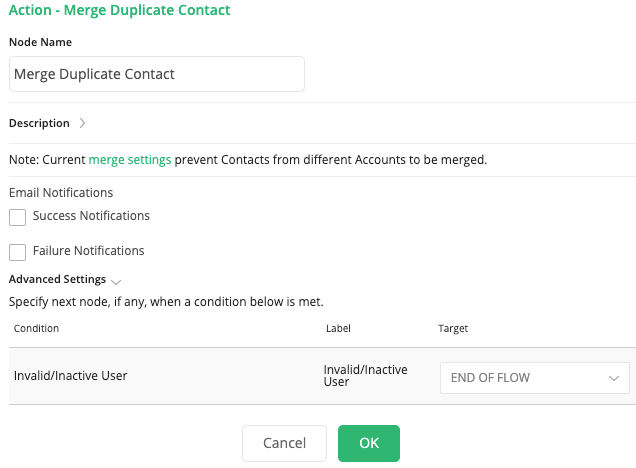 The email notifications allow you to configure how the Merge Dupe Contact Node can notify Users of either a successful merge or a failure. You can select an email template and list of recipients.