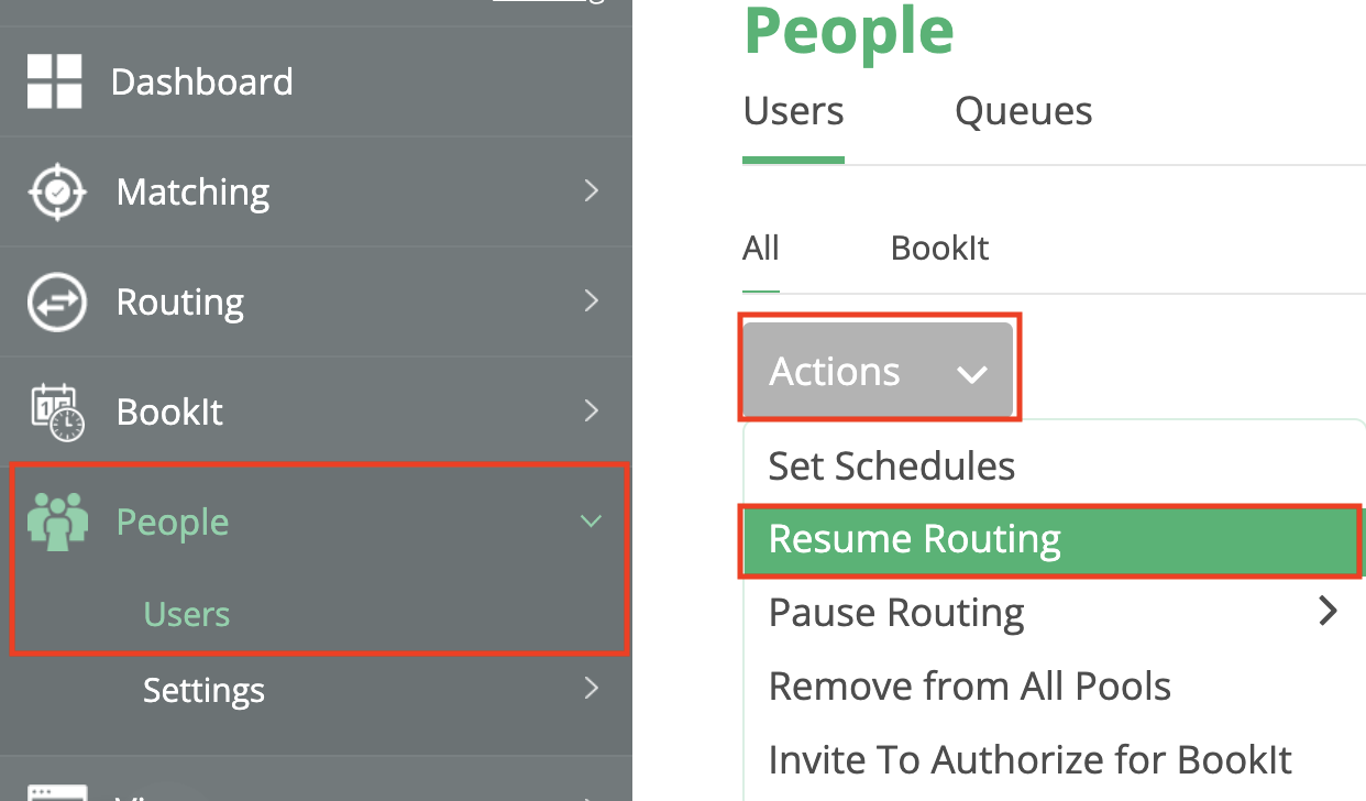 If you had paused a User for a specific time frame, their availability will resume automatically after that time frame elapses. To resume routing to a User that is still paused, navigate to People → Users → then select the Users or Queues you wish to resume.