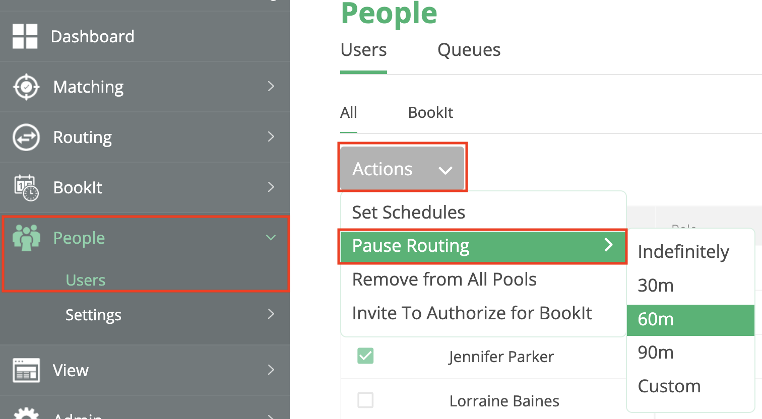 To pause routing to a User, navigate to People → Users → then select the Users or Queues you would like to Pause.