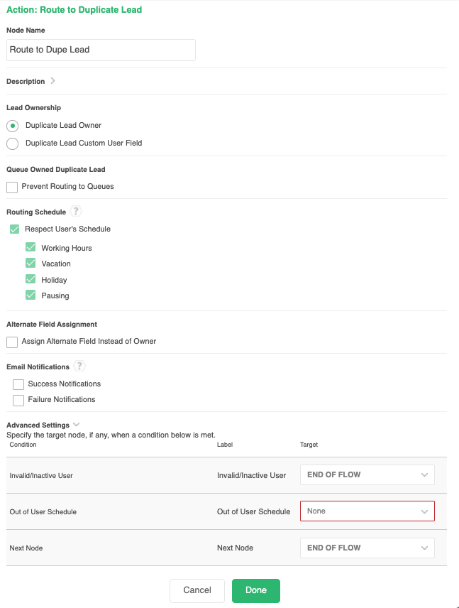 The Route to Duplicate Lead Node will allow you to assign a Lead to a User related to the Duplicate Lead the incoming Lead has matched to. This node allows you to control how you assign the owner as well as tools for sending notifications on success or failure of the assignment. There are also fallback conditions to manage if the User is invalid or inactive.