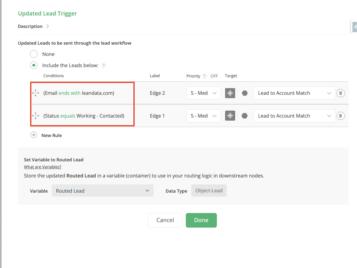 Example: A Lead record routes and enters the Hold-Until node shown above. While the record is in the Hold-Until node, it is updated to have an Email ending in "leandata.com" and Status equal to "Working - Contacted." This condition is a trigger rule in the Updated Entry node. However, because the nodes have the same condition and the Lead is already in the Hold-Until node, the latter takes priority and the Lead exits the Hold-Until node without triggering the Updated Entry node.