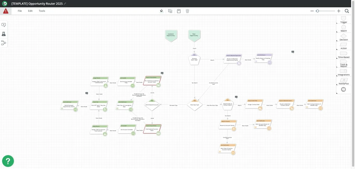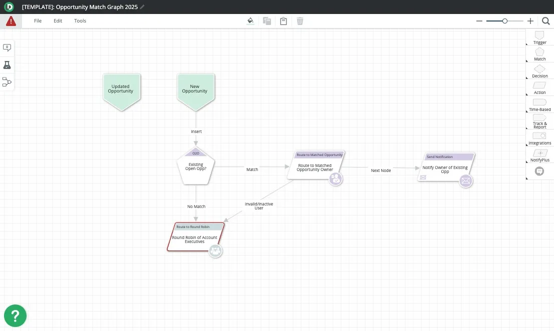 Lead Smart Rep Suggest: Standard Graph Lead Smart Rep Suggest routes meetings by first checking for duplicate Contacts, Leads, or Account matches, booking time with the appropriate owner. If no match is found, it routes by geo using round robin for North America and a designated user for Rest of World. |