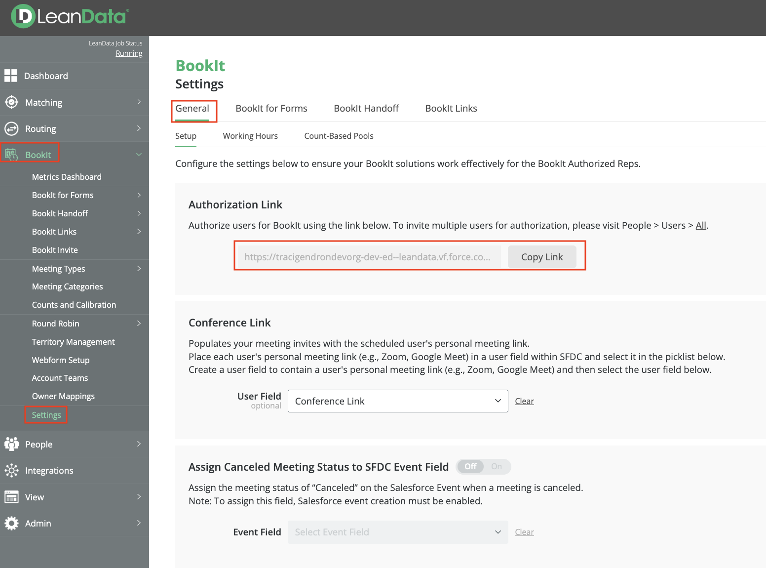 In order to authorize Users for BookIt using a direct link, please navigate to your LeanData Dashboard, then select BookIt > Settings.