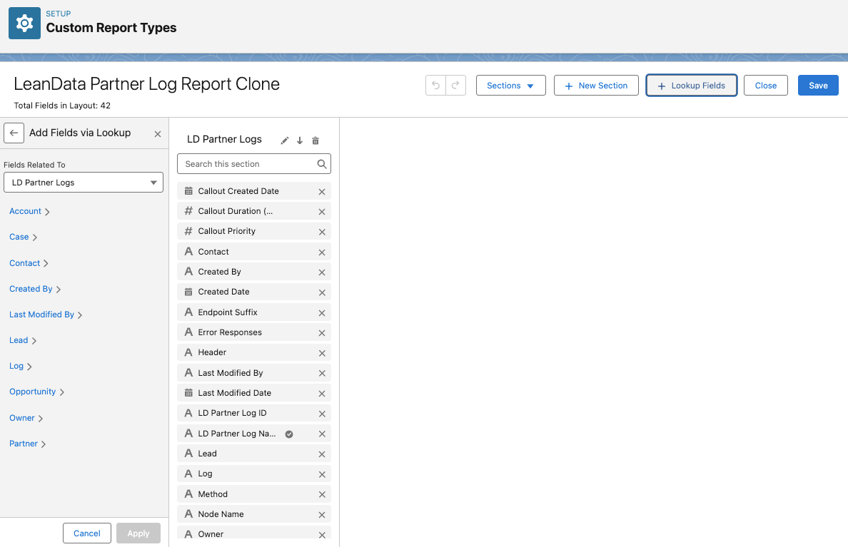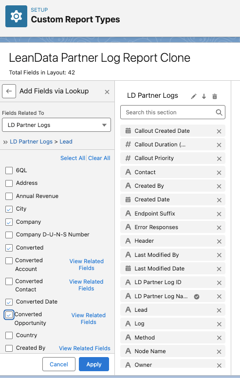 Before creating your reports and dashboards, you can customized the fields available in Report Type Layout. By default, the LeanData Partner Log object comes with 42 fields specific to the callout action, and almost all fields are available by default. The Partner Log object is not related to other objects that provide additional fields for reporting, but can pull in record data via Lookup fields on the Account, Case, Lead, Opportunity, and Contact objects, as well as some relevant metadata.