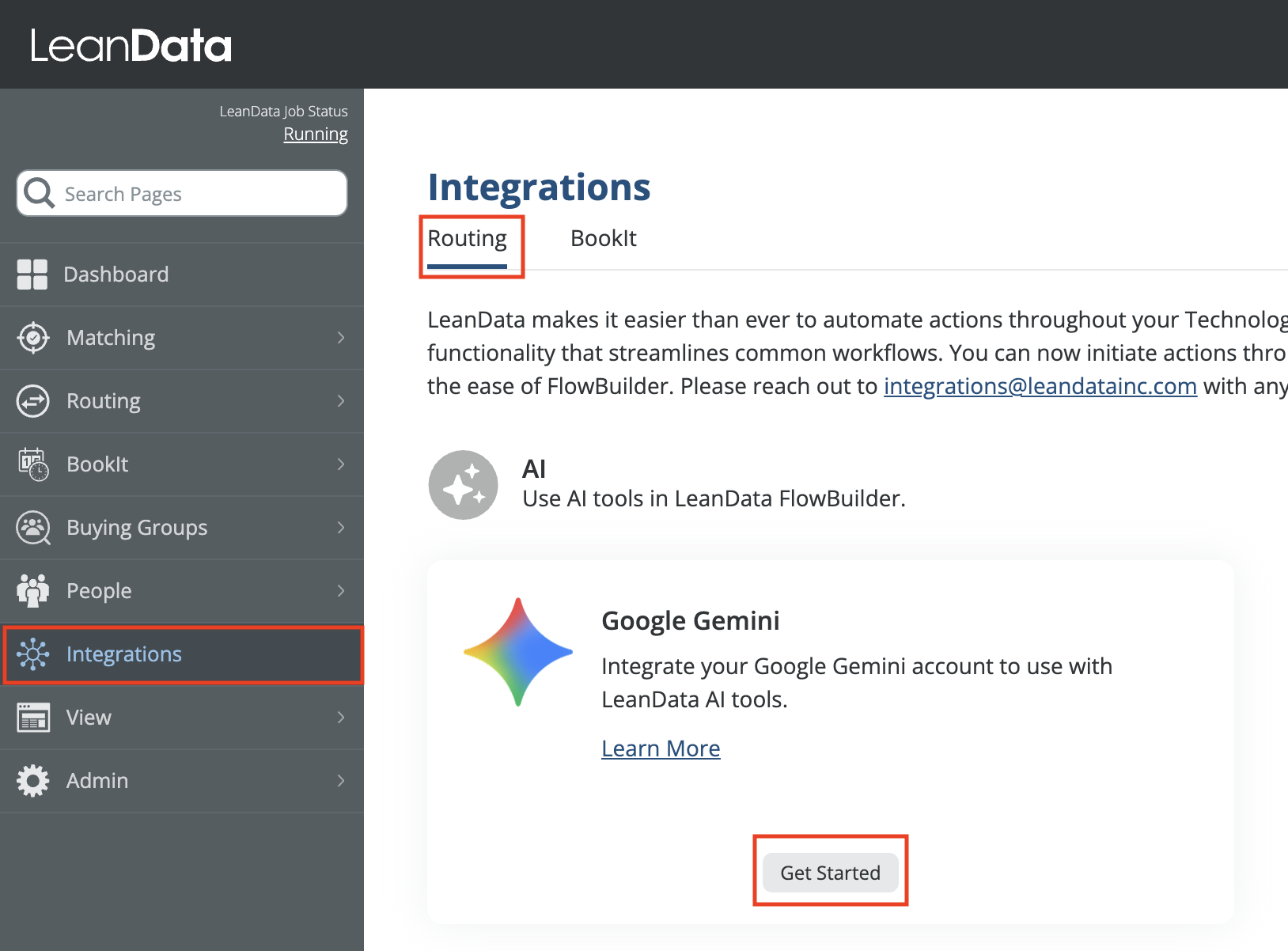 To use your own Gemini API Key, from the LeanData App, navigate to Integrations > Routing Tab > Google Gemini. Click on the Get Started button on the tile.