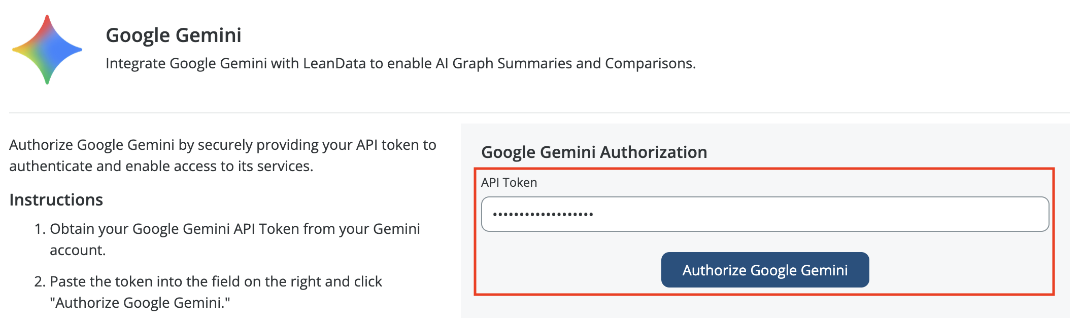 Once you've obtained your Google Gemini API Token from your Gemini account, paste it into the Google Gemini Authorization section and click Authorize Google Gemini.