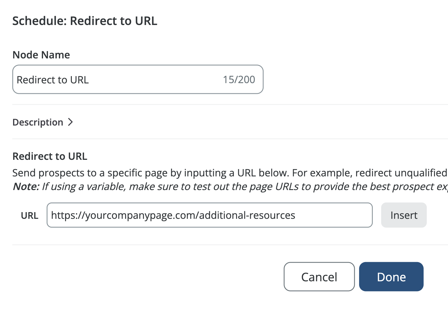 In the Redirect to URL section, enter the full URL where you want to redirect prospects. This should be a complete URL including the protocol (e.g. https://www.yourcompanypage.com/additional-resources).