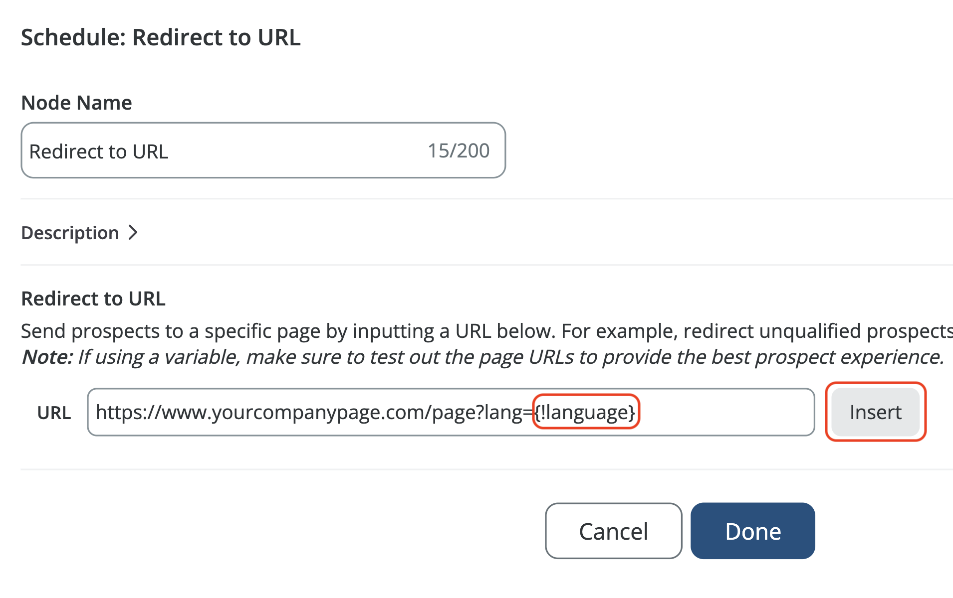 To include variables in your URL, click the Insert button and select the variable you want to add.